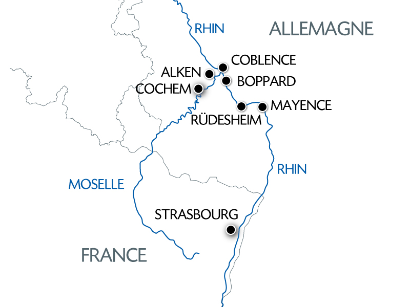 De Strasbourg à Cochem, découvrez la magie de la vallée du Rhin romantique et de la Moselle. Une croisière exceptionnelle où les fleuves serpentent entre rochers abrupts et châteaux forts qui dominent des coteaux de vignobles témoins d'une histoire mouvementée. Explorez d'authentiques villes et villages aux secrets bien cachés. Entre toits d'ardoises et colombages de style médiéval, vous pourrez admirer Alken et son château Thurant ou encore vous balader à Boppard le long de l'une des plus belles berges d'Allemagne.